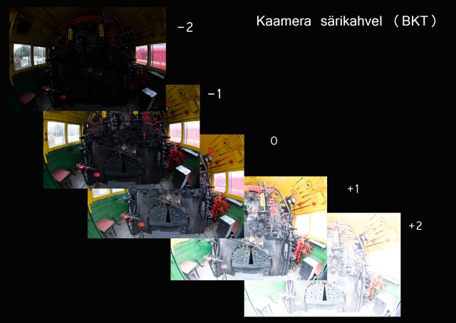 - Kui kaameral on selline funktsioon olemas, võib edukalt kasutada ka peegelkaamera särikahvli abi. Sageli tähistatakse seda inglise keelest tulenevalt tähelühendiga BKT. Enamate võtete puhul tuleb enne järgmise kaadri tegemist muuta pildi säritust. Kaadrite heleduste erinevus võiks olla 1 kuni 2 astet. Jälgi, et kõige heledamas kaadris oleks kirjeldatud tumedad alad ning kõige tumedamas kaadris helendid, näiteks taevas. Kontrolli säritust histogrammi kasutades.