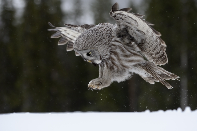 The owl abruptly "dives" from the tree towards the snow surface to reach maximum speed, and at this fast speed, approaches the prey. It is indeed a blistering bird. Only a fast lens and camera will let you to lock the focus on the bird and follow it all the way to its target. Better set up your camera to 'Shutter Speed Priority' mode and set the shutter speed of about 1/3200 sec. ISO value should be set at the maximum, as far as quality permits. At the time of shooting the camera will automatically adjust the appropriate aperture value. And since you are photographing a bird against a white snow background, do not forget to use exposure compensation: +2/3 – 1 EV.