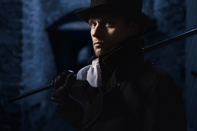 The model has been dressed, the assistant is present. We kindly have to ask two drunken tourists to leave the set because they want have a photo taken with Sherlock. The sky is still in its evening colours and everything is ready on the set. But then, at the most inconvenient time, the streetlights are turned on. The whole thought-out plan is not working anymore. Now, we have to start everything from the scratch and take into consideration that we have extra sources of light which have their own colour temperature and which cannot be reorganised in any way. This kind of situation tests the performance of the speedlights quite hard. You need to put a yellow filter in front of speedlight that is lighting Sherlock to unify the colours of the speedlight and street lights. The speedlight located in the far side of the street gets a blue gel filter in front of it and this light provides tone to the background walls and generates interesting contra light on the model.